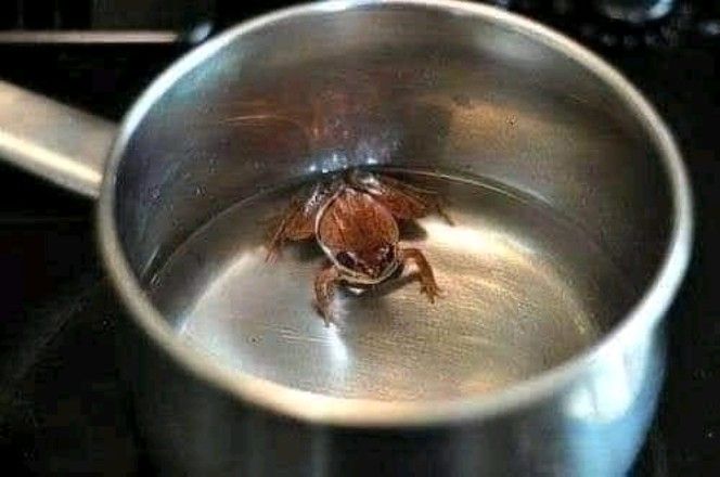Si vous mettez une grenouille dans une casserole remplie d’eau et commencez à chauffer l’eau [ce que je ne vous recommande en aucun cas ;)], vous observerez que lorsque la température monte, la grenouille s’adapte et ajuste au fur et à mesure sa température corporelle en conséquence. Lorsque la température devient trop forte, la grenouille prend la décision de sauter de la casserole ; mais n’y parvient pas car elle a perdu toute sa force en ajustant sa température corporelle. Très vite, la grenouille meurt.