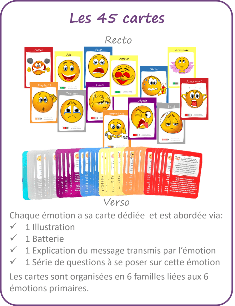 - Chaque carte représente une émotion (ex : la peur, la tristesse, la colère, la joie, etc.).