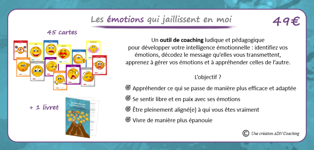 A partir de mes expériences personnelles et en tant que coach, j’ai créé un outil de coaching complet, ludique et pédagogique, qui permet à toute personne de s’auto-coacher en profondeur sur ses émotions et aux coach ou accompagnateurs professionnels de bénéficier d’un outil concret pour creuser et coacher les émotions de leurs clients.